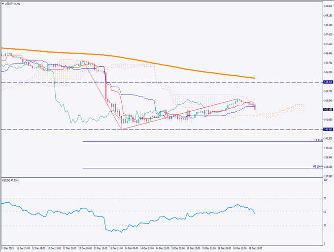 ドル円相場の1時間足チャートを分析する。現在、RSIは48であり、50を割り込む動きをしている。このことから再び下落基調が示唆されている。チャート上では「N字」の形状が想定され、140.950円を割り込むかどうかが重要なポイントとなる。