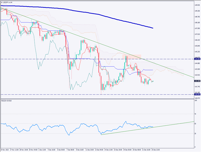 今後の焦点は140.95円を割るかどうかにあり、RSIは37と下落基調を示す水準にある。2024年1月は140円付近での攻防が予想される。