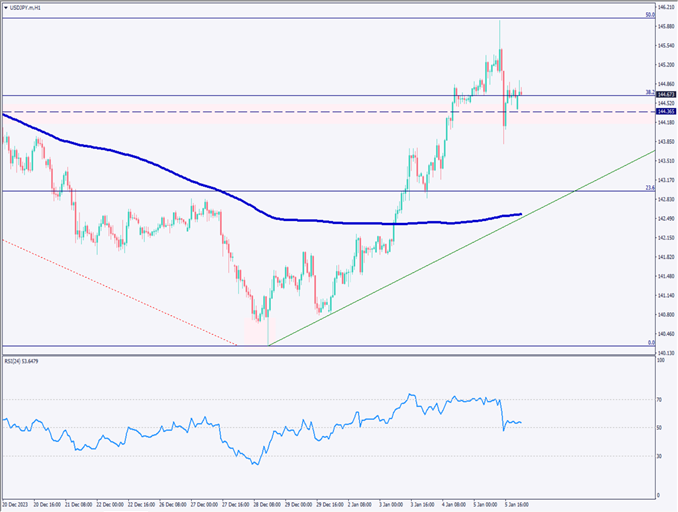 ドル円相場の1時間足チャートを分析する。38.2%のフィボナッチリトレースメントで反応が見られ、144.30円より下の下値は堅い状況が示されている。RSIは53付近で推移中で、50を下抜けするか、あるいは反発するかが今後の方向性を示すポイントとなりそうだ。