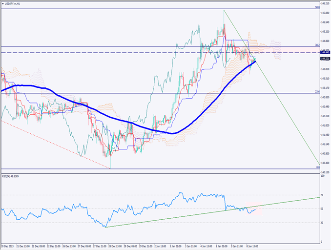 ドル円相場の1時間足チャートを分析する。90移動平均線は下値の支持線として機能しており、このラインを割ると、相場は大きく下落する可能性が高い。RSIは47となり、下落基調を示している。通貨強弱を考慮するとドルがやや優勢であり、相場は一時的に144.40円付近まで戻ることもあり得る。