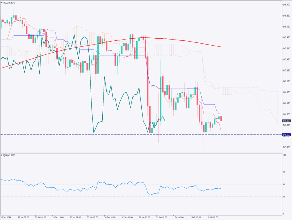 ドル円相場の1時間足チャートを分析する。146.05円付近で2回反発しており、全体的にドル安傾向が見られる。146.05円を割ると、145.88円を目指す下落が予想される。現在は、基準線が上値を抑えており、再度安値にトライしようとしている段階だ。RSIは43で推移している。