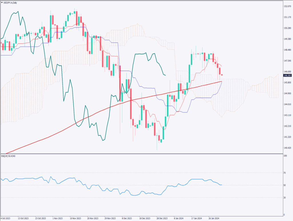 ドル円は続落、一目均衡表の雲にぶつかる【2024年2月2日】