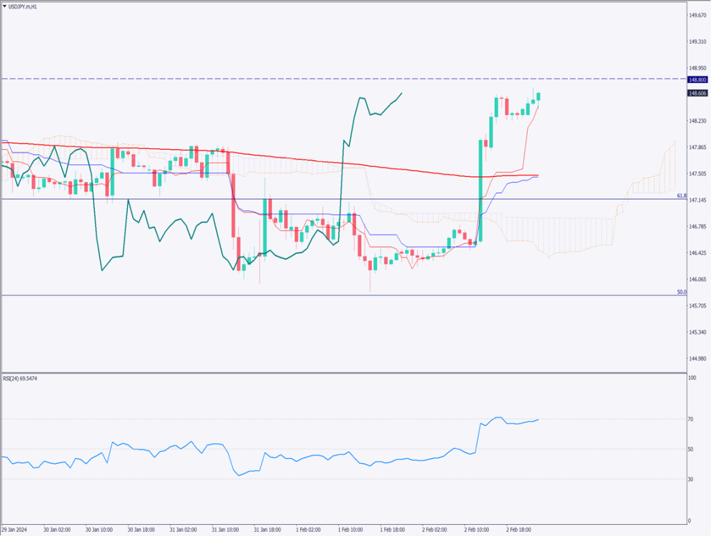 148.80円の高値を超えるのは時間の問題であり、超えればストップロスを巻き込んで一気に150円台に上昇する可能性を考える。ただし、RSIが70に到達しているため、急な上昇の後には急落が待っている可能性がある。そのため、過剰な追いかけ買いは避けたい。