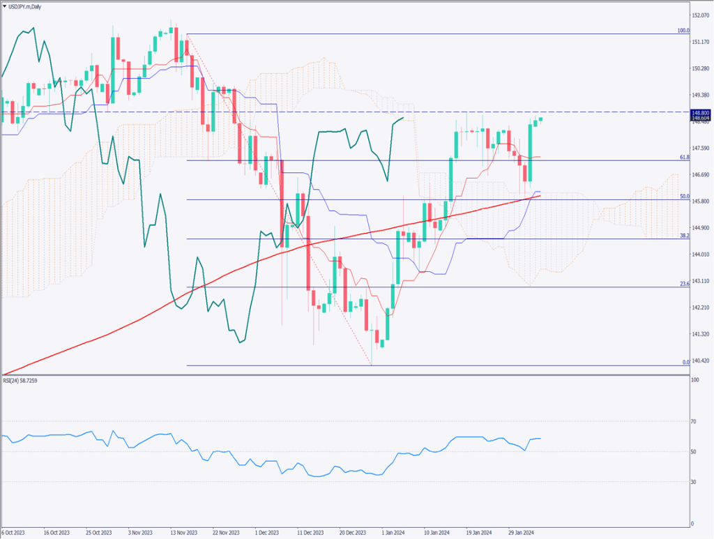 ドル円の日足チャートを分析する。ドル円は米雇用統計の力強い結果を受けて、148円台半ばまで上昇した。ドルの強さを示すドルインデックスは急騰し、ドル高傾向が今後続くことを示唆している。