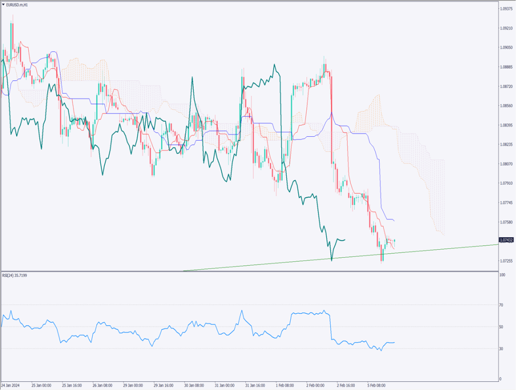 ユーロドルの1時間足チャートを分析する。ユーロドルは急落し、1.089ドルから1.074ドル付近まで下落した。日足上昇トレンドラインにぶつかり、やや調整の反発の動きが観測される。