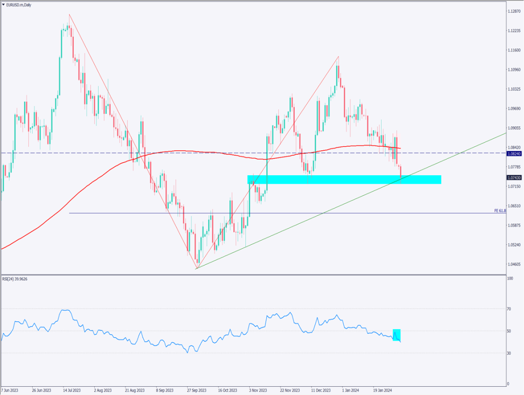 ユーロドルの日足チャートを分析する。現在、上昇トレンドラインにぶつかっており、やや反発していることから、意識されていることが確認できる。1.072ドル~1.075ドルは過去に大きく反発したポイントであり、今回も意識される可能性がある。