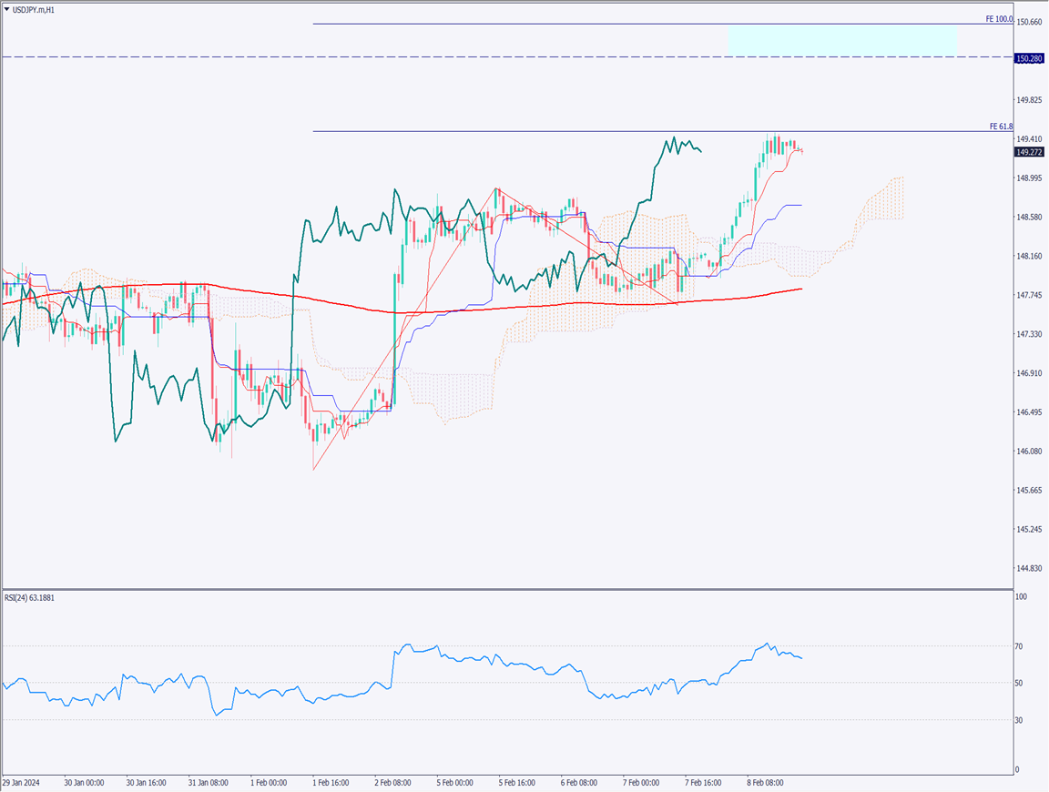 ドル円の1時間足チャートを分析する。149.47円まで上昇して、利益確定売りで反落している。しかし、一目均衡表の転換線で支えられている。