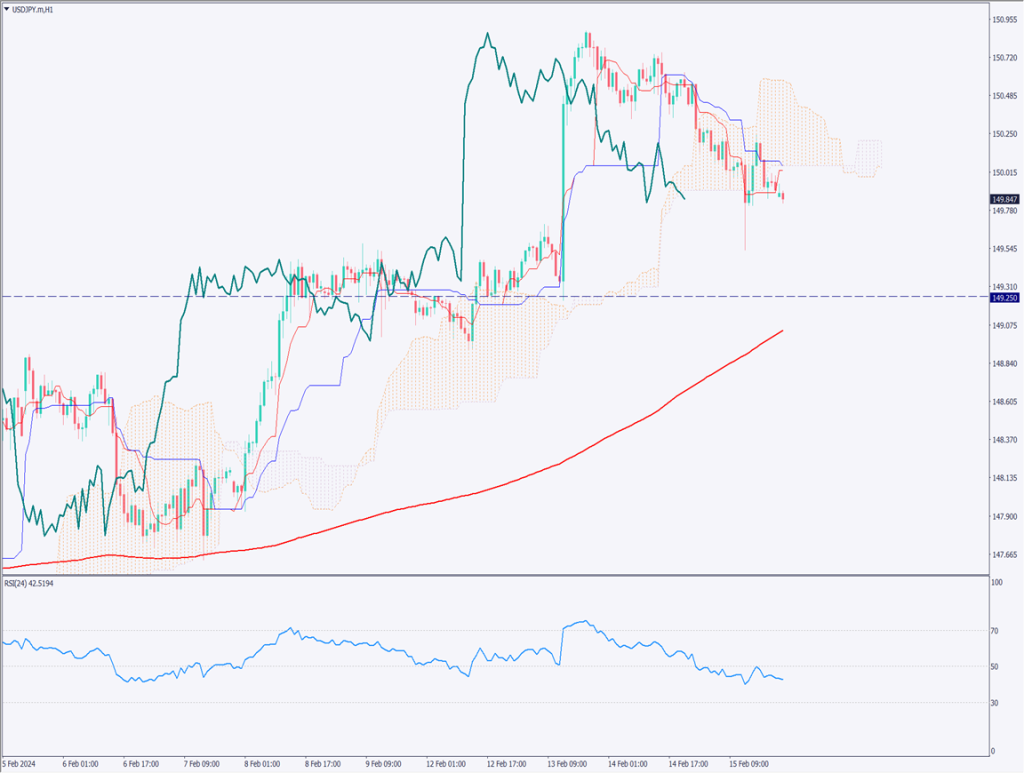ドル円の1時間足チャートを確認する。昨日の米小売売上高発表後に急落し、149.50円付近まで一度下落している。149円半ばでの買い意欲はやや強い。テクニカル的に分析すると、一目均衡表の雲を下抜けしており、150円台に戻るには、やや強い材料が必要だ。