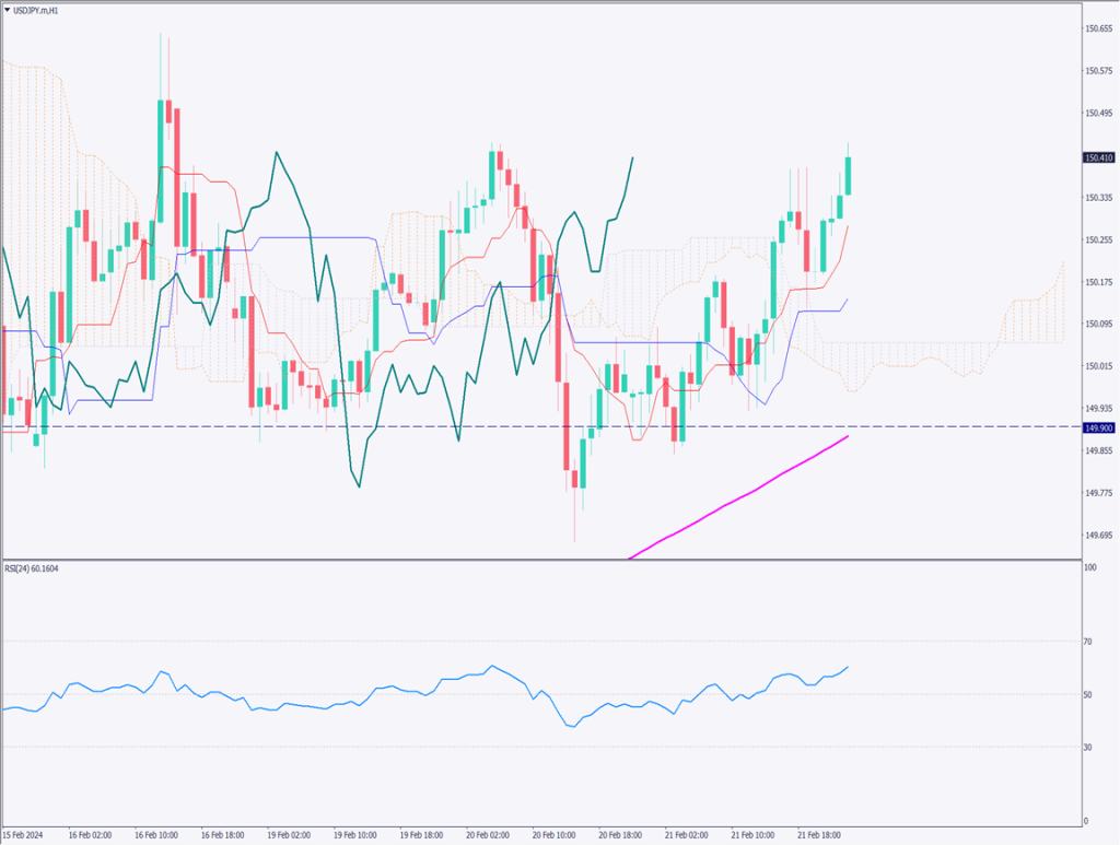 ドル円は一目均衡表の転換線で反発し、150.40円付近まで上昇している。150円より下値には買い指値が多くあり、下値が固められている。また、現時点で円買い材料がなく、ドル高に傾きやすくなっている。