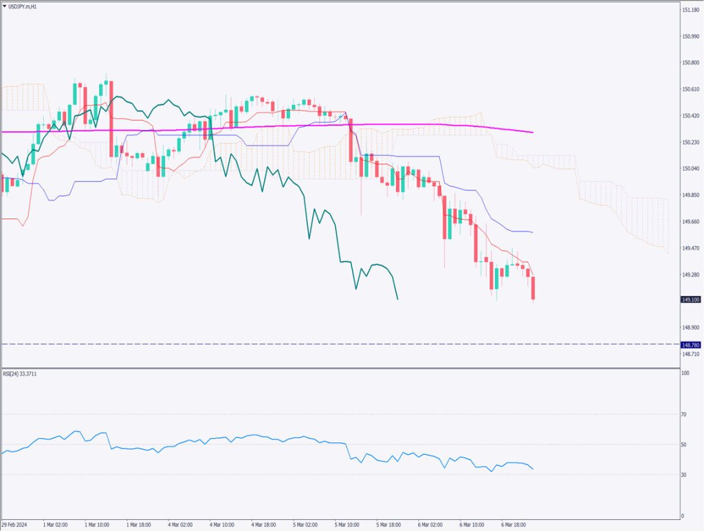149円前半から148円台に突入している。RSIは33となっており、安定的な下落基調を示している。