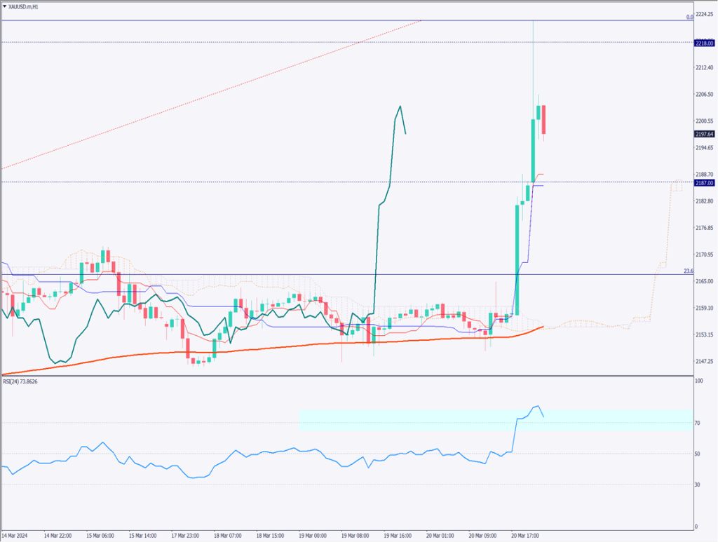 ゴールドの日足とファンダメンタル分析をする。本日未明のドットチャートで、パウエルFRB議長は2024年内の3回の利下げ予想を維持とした。政策金利は5会合連続で維持とし、高金利のドル高は続くものの、ゴールドは買い注文が集中した流れとなった。