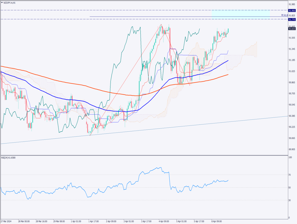 NZ円の1時間足チャートを分析する。転換線が支持線となっており、強い上昇基調となっている。91.77円~91.90円には強い抵抗帯があるため、一度反落する可能性に注意したい。RSIは64で推移しており、安定的な上昇を示す。
