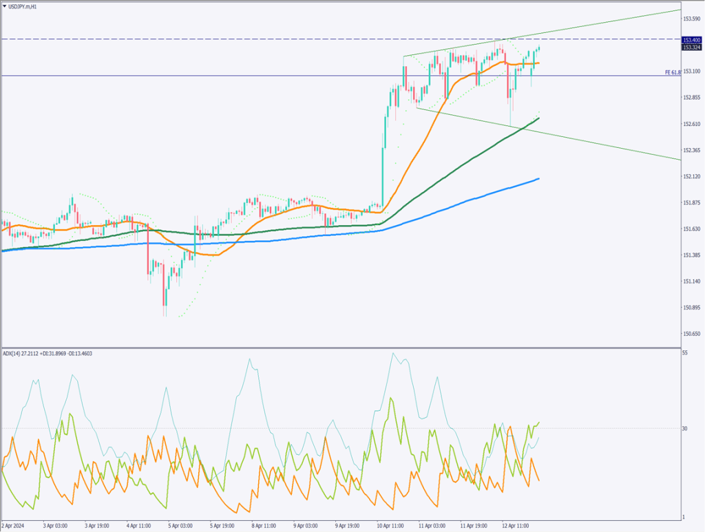 ドル円の1時間足チャートを分析すると、拡大トライアングルを形成している。拡大トライアングルは相場が不安定になっており、上昇トレンドの途中で発生した場合は、最終的に上方ラインをブレイクアウトするとされる。