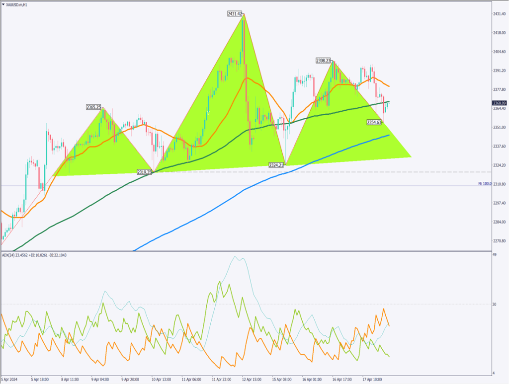 デイトレード方針は2360ドルの下方向へのブレイクアウトで売り、2345ドルで決済。2370ドルでストップとする。
