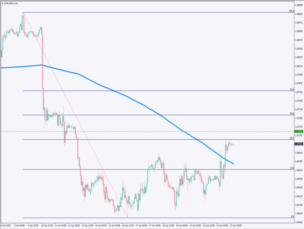 ユーロドルの1時間足チャートを分析する。フィボナッチリトレースメントを描画すると、38.2%の価格帯でやや反落しており、意識されていることが確認できる。上値には日足のネックラインである1.072ドルがあり、やや上値が重いと考える。
