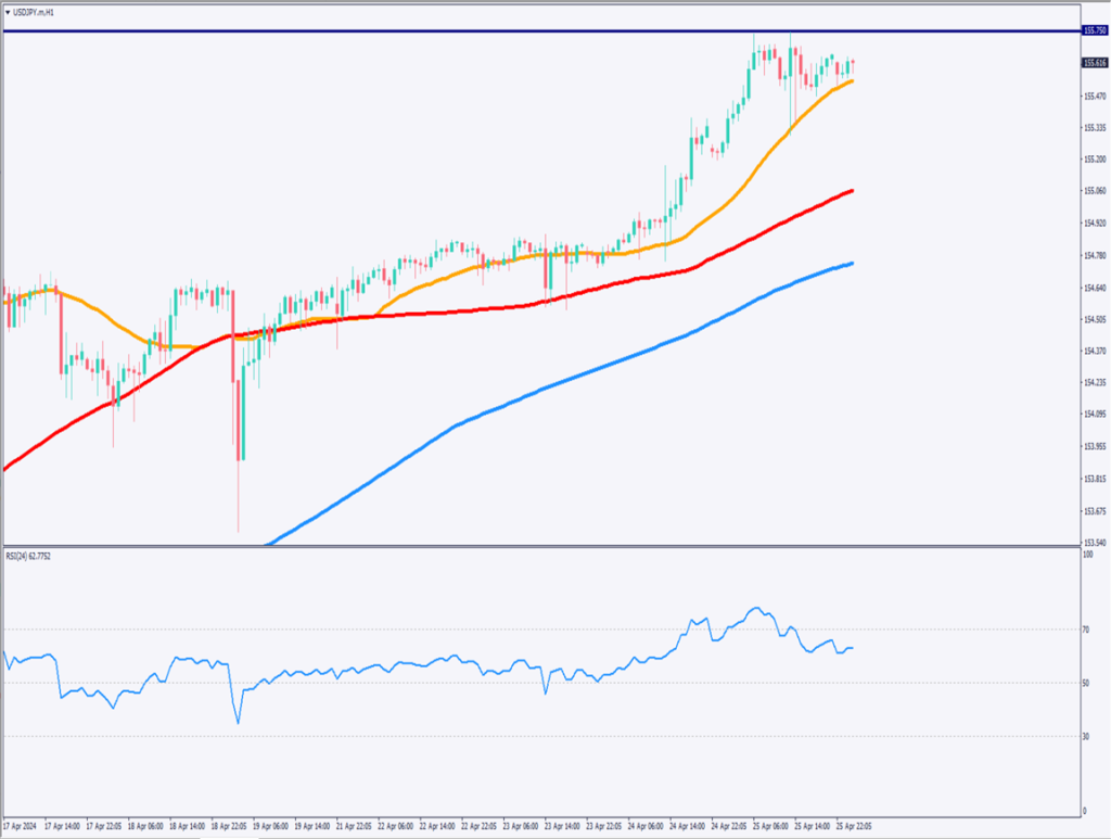 ドル円の1時間足チャートを分析すると、直近高値である155.75円をいずれ更新すると考えるのが自然だ。日足のRSIは74となっており、やや過熱感があるのは事実だが、1時間足のRSIは63となっており、155.75円を再び突破しようとトライする可能性がある。