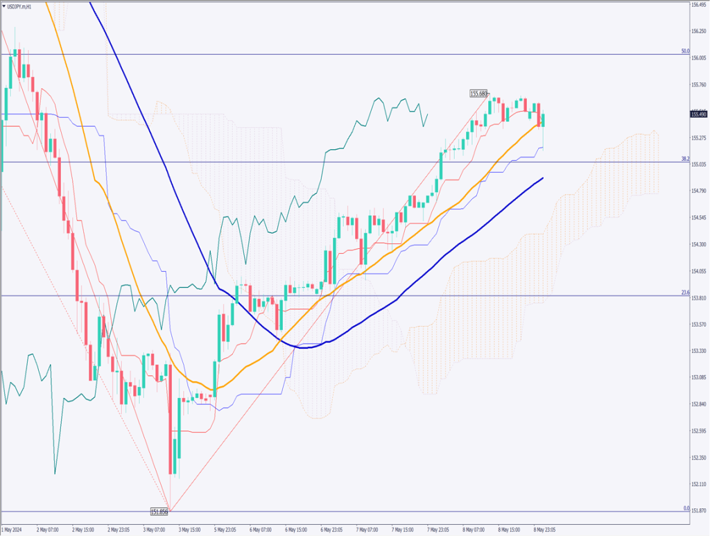1時間足のフィボナッチリトレースメントの半値に該当するのは156円付近。本日は156円が高値となりそう。