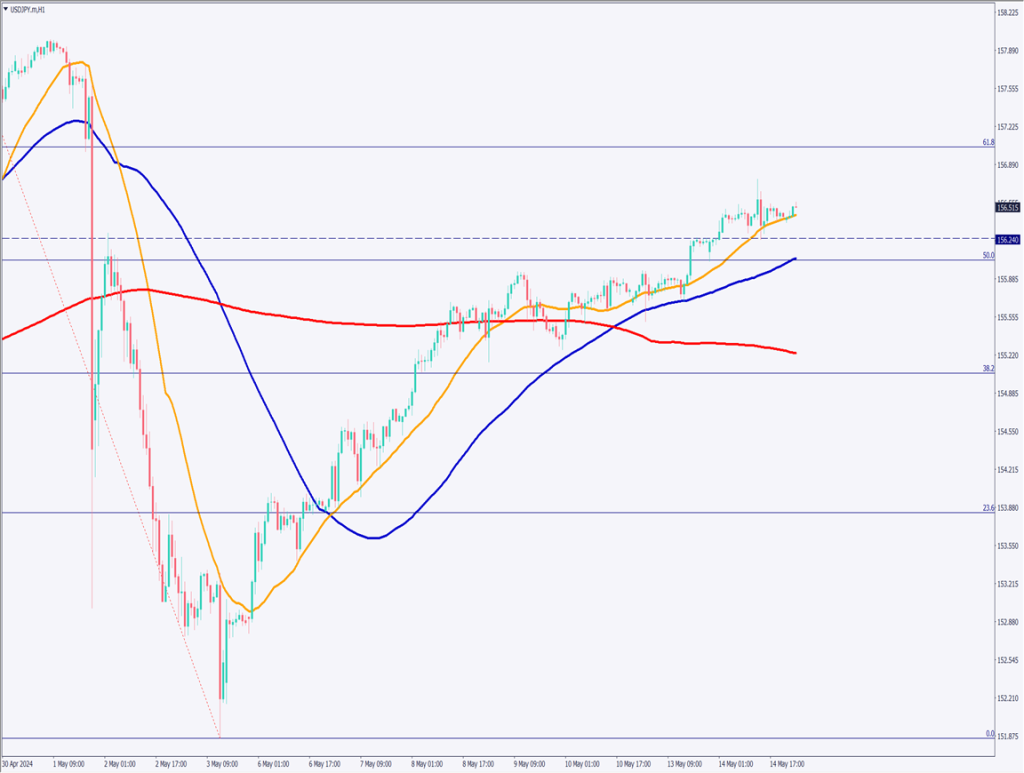 ドル円の1時間足相場を分析する。24移動平均線が支持線として機能しており、156.24円を支持線に反発している。フィボナッチ61.8%に該当するのは157.00円付近であり、ここが次の抵抗線となる可能性が高い。