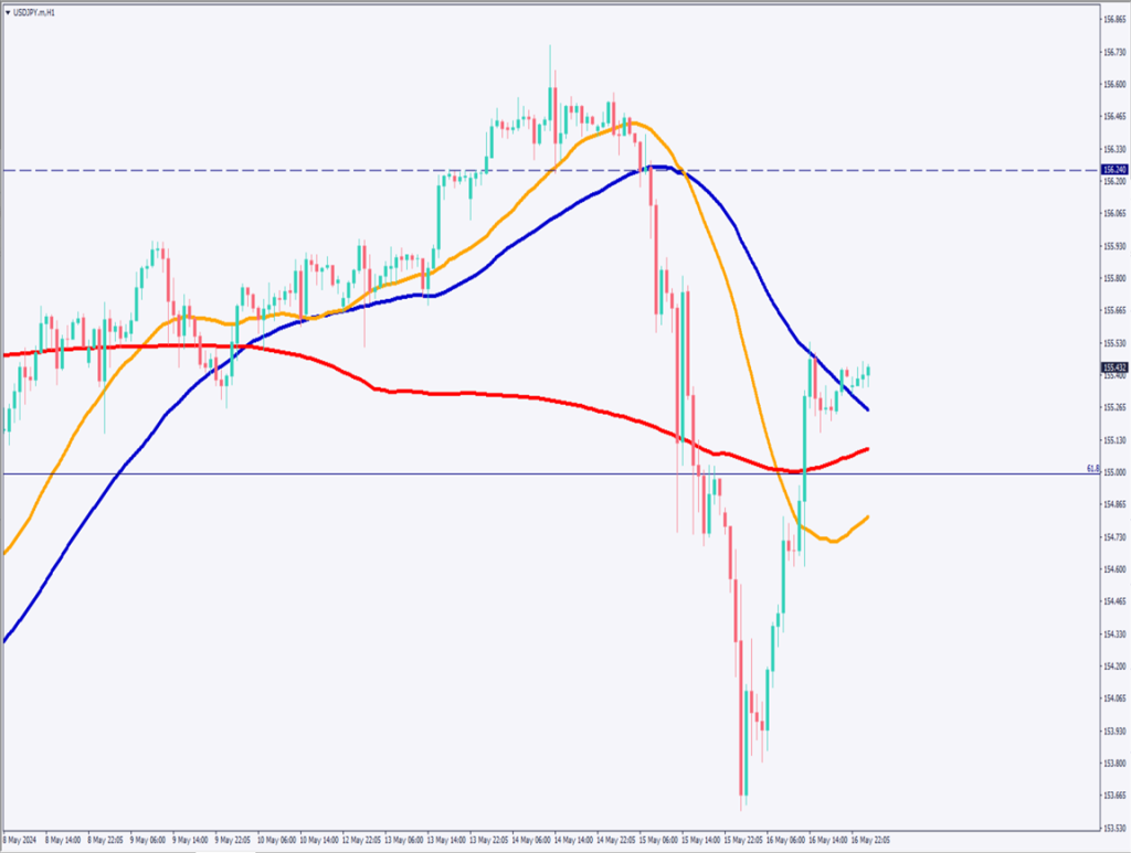 ドル円の1時間足チャートを分析すると、156円台から153円台へ急落した後、155円台へ回復している。現在、155.50円を上回って推移しており、ボラティリティが非常に大きくなっている。この状況では、ショートカバーによって再び156円台を狙う可能性もある。