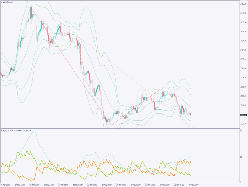ゴールドの1時間足相場を確認する。ゴールドは2327ドル付近で反発した後、緩やかな調整を続けていたが、再び下落に転じている。ADXを確認すると、-DIが-25、ADXが30を上回っている。下落トレンドが強まっている証拠だ。