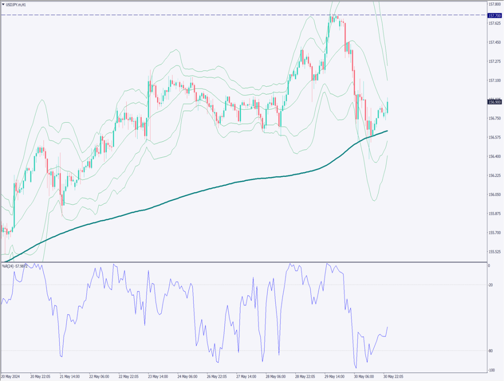 ドル円の1時間足チャートを分析すると、2週間の移動平均を示す240移動平均線で反発している。ウィリアムズ%R(24)は-57となっており、過去24時間の最安値からやや反発しているものの、依然として下落基調の水準にあることを示している。