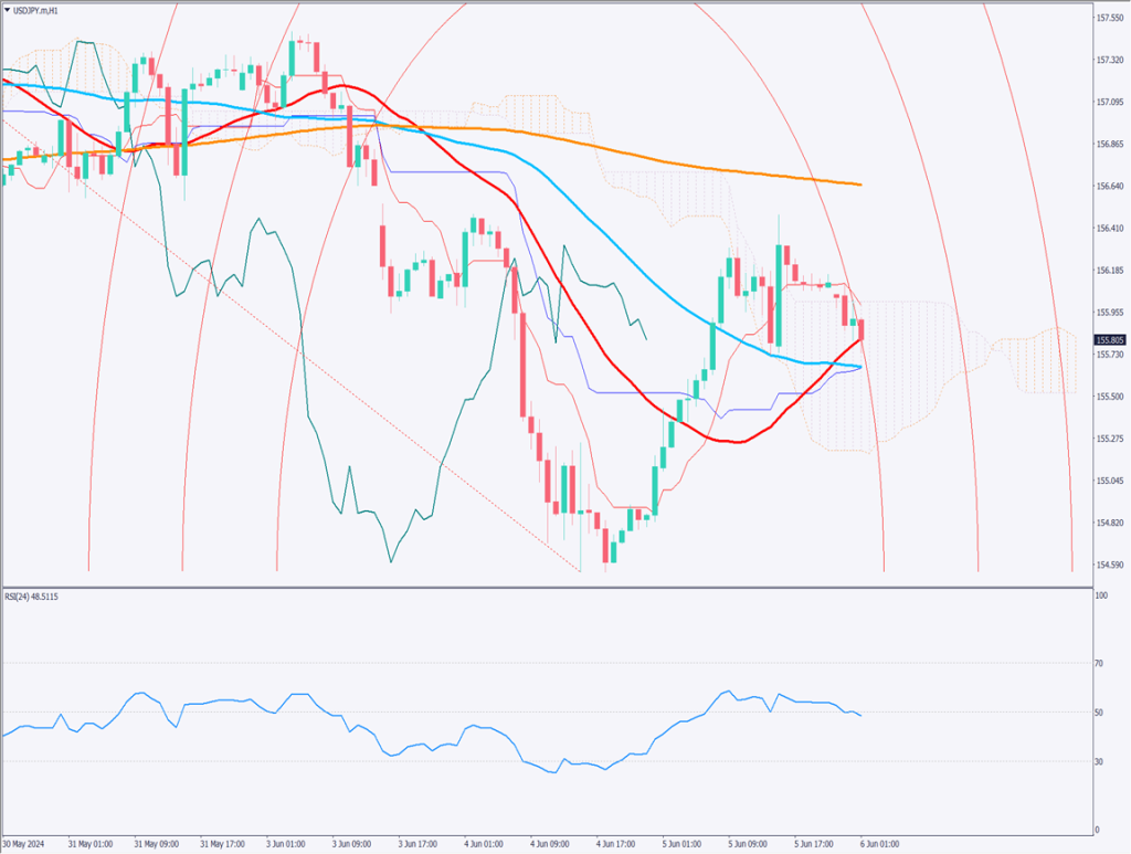 ドル円の1時間足チャートを分析する。ドル円は戻り高値を形成中か。156.48円まで上昇したあと、午前中から反落気味となっている。RSIも50を割っており、再び下落基調を示す水準になった。フィボナッチアークの38.2%が抵抗線として機能しているのかもしれない。