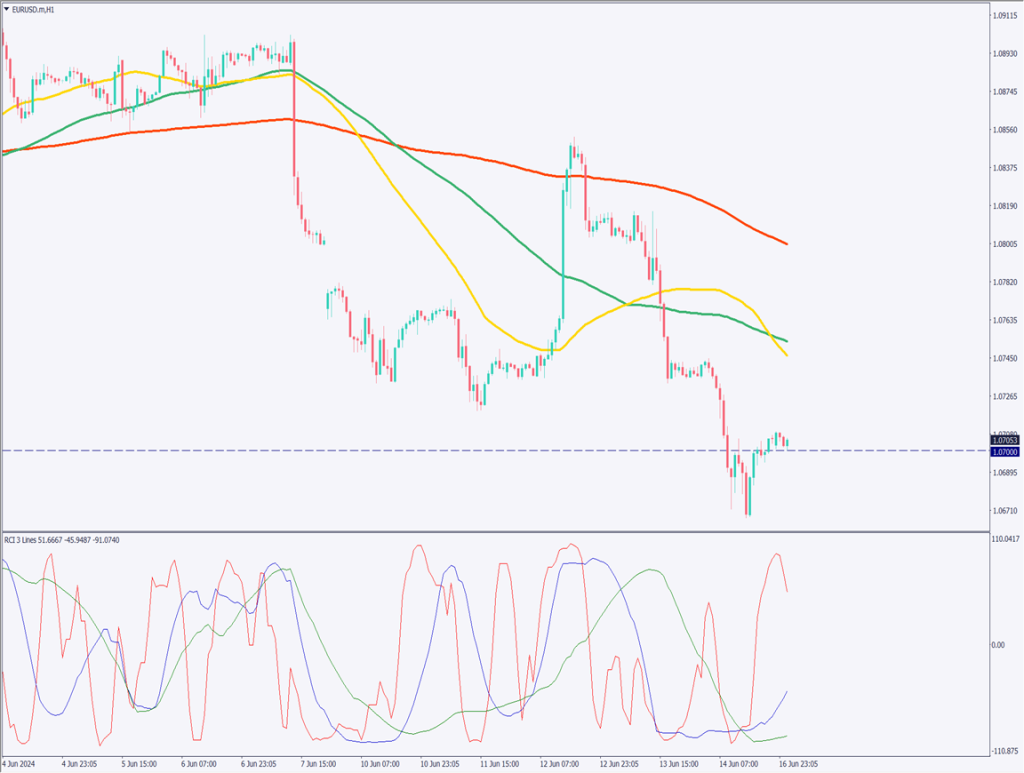 ユーロドルの1時間足チャートを分析する。ユーロドルはフィボナッチエクスパンションの100%に該当する1.067ドルで見事に反発し、1.07ドル付近で推移している。下落の勢いはやや収まったものの、1.067ドルが次の目標安値となる。短期移動平均線が再び中期移動平均線を下回り、パーフェクトオーダーの並びとなっている。