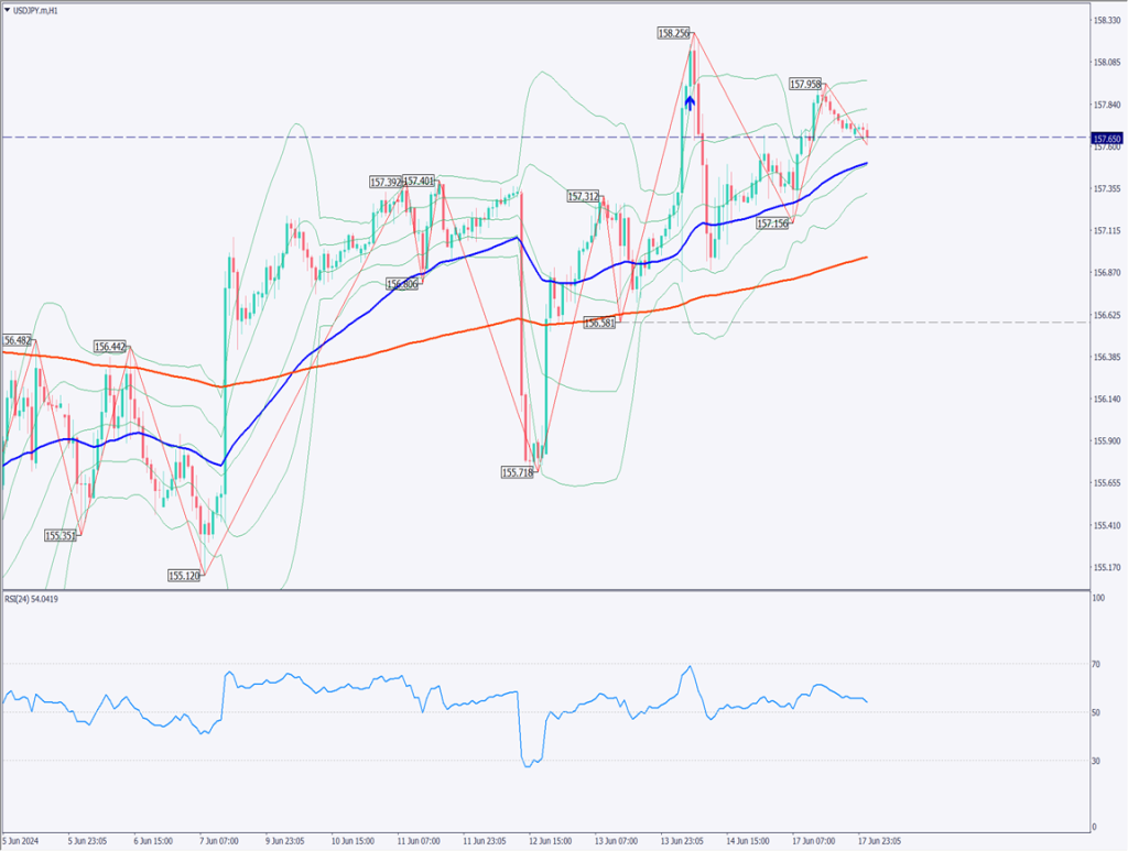 ドル円はボラティリティは小さいが、続伸。157.95円付近まで上昇している。ボリンジャーバンドの+2σ線を超えて推移しており、上昇基調が続いている。157.70円の高値を上回り、ダウ理論による上昇トレンドが発生している。