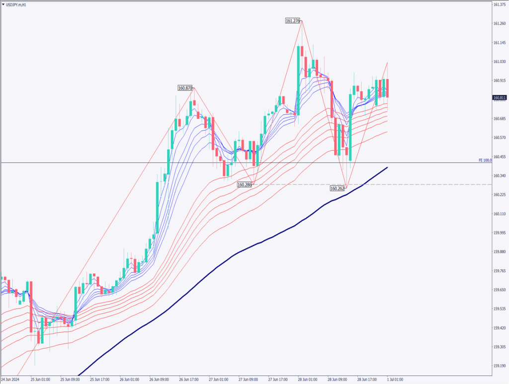 ドル円の1時間足チャートを分析する。161円台では反落しているものの、160.40円で反発しており、押し目買いが継続している。直近高値は161.27円であり、上抜けするかに注目だ。上抜けした場合、161円台を目指す可能性が高い。