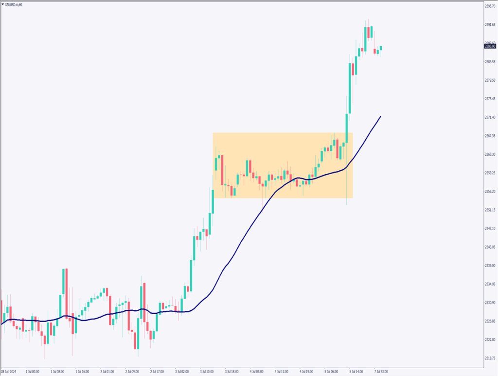 ゴールドの1時間足チャートを分析する。米雇用統計発表後にゴールドは急騰。米利下げ観測が高まり、2400ドル手前まで伸びている。利下げムードが高まっているため、引きつづき堅調な上昇を予想する。