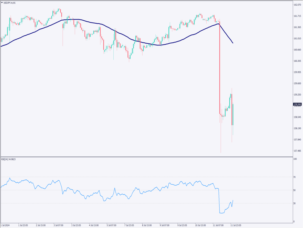 1時間足では、為替相場でドル売りが非常に大きかったことが理解できる。ただ、大きなタクリ線となっており、押し目買い意欲が非常に強い。現在は159円台で推移しており、今後157.40円を下回れば、円高方向への転換とみなせるかもしれない。