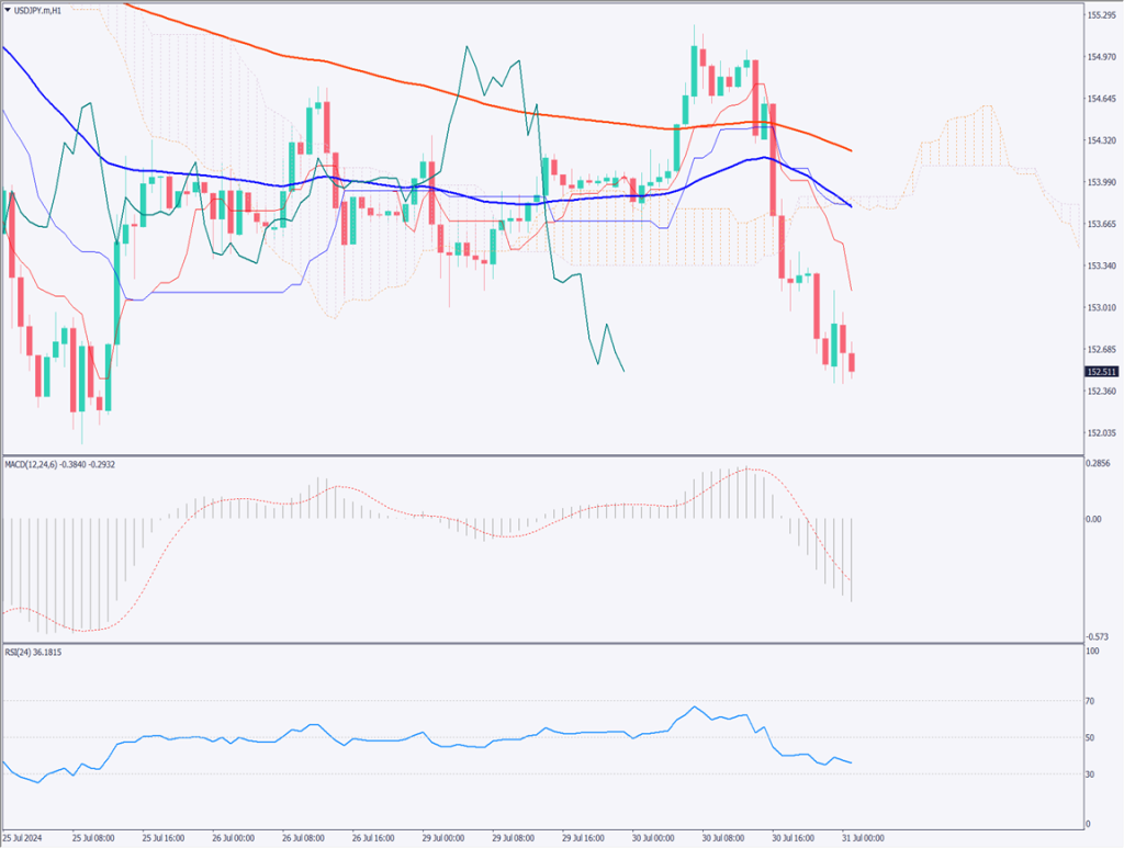 ドル円は155円台に上昇したが、円買いの動きが強まり152円台に下落している。NY時間の深夜に日銀が利上げを検討という報道が流れ、円買いの動きに拍車が掛かった。米株価指数が急落しており、米景気にやや暗雲が立ち込めている。米FOMCでは利下げに関する何らかの方針が示されると市場は考えている。