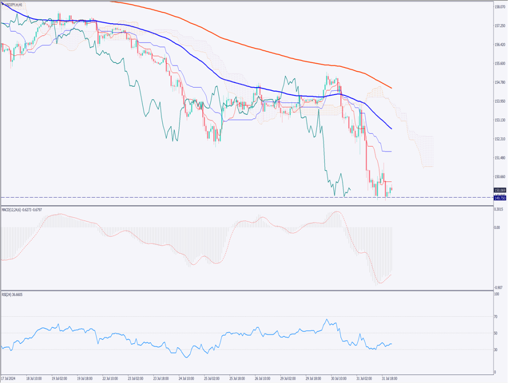 ドル円の日足チャートを分析する。日銀の追加利上げの決定により、ドル円は急落。総裁記者会見では、タカ派と受け取られるコメントを繰り返し、今後も利上げ方向への動きを進めていく考えを示した。一方、米FRBのパウエル議長は9月の利下げを示唆。