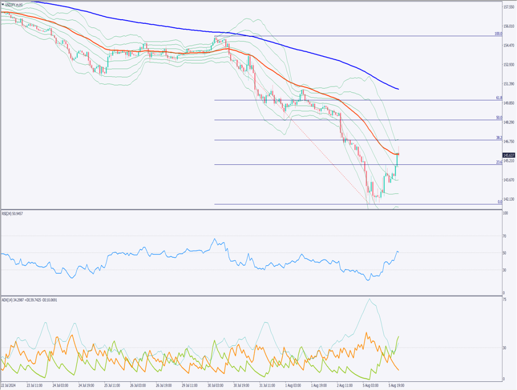 1時間足のドル円チャートを分析する。1時間足では52移動平均線が参考になる。141円台まで下落した後、145円に戻っている。通常で考えると、恐ろしいほどのボラティリティだ。1時間足のATRを見ると、期間12つまり半日の平均ボラティリティが90Pipsとなっている。