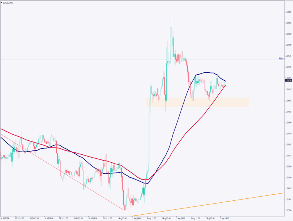 1時間足のユーロドルチャートを分析する。90移動平均線に支えられて上昇している。1.09ドル付近の堅さを確認し、やや上昇目線となっているようだ。しかし、90移動平均線を割り込めば、調整で直近の上昇相場の61.8%に該当する1.0865ドル付近まで下落する可能性もある。