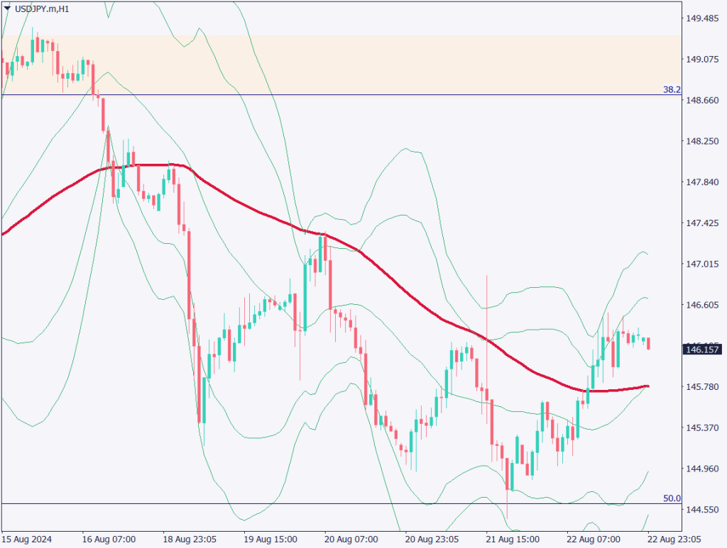 ドル円の日足チャートを分析する。ドル円は週足フィボナッチの半値に該当する144.60円に2回反発している。チャートパターンではダブルボトムを連想させる。ネックラインとなるのは38.2%に該当する148.70円。148.70円付近にはボリンジャーバンドの中央線も推移しており、パウエル議長の講演待ちと考える。