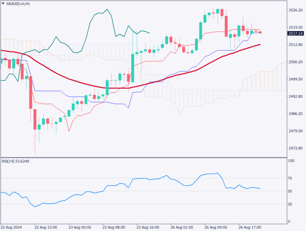 ゴールドの日足チャートを分析する。ゴールドは米利下げ観測が高まったことで上昇基調となっている。一目均衡表の転換線が支持線となって、2517ドル付近で推移している。2500ドル台での推移が続いており、利下げ期待が高まっている状況ではゴールドに資金が流れやすい。