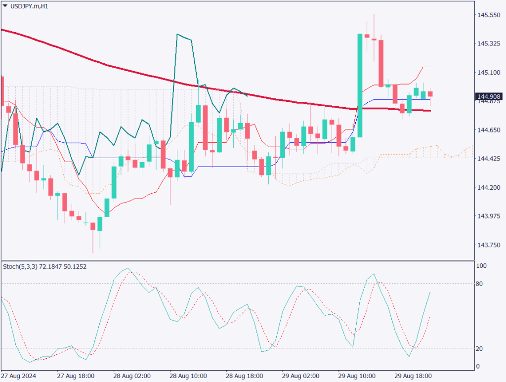 1時間足のドル円チャートを分析する。ドル円は200移動平均線が支持線になっている。また一目均衡表の基準線も支持線として機能している。上昇トレンドラインを描画できるが、144.75円が1つの節目となる価格帯。