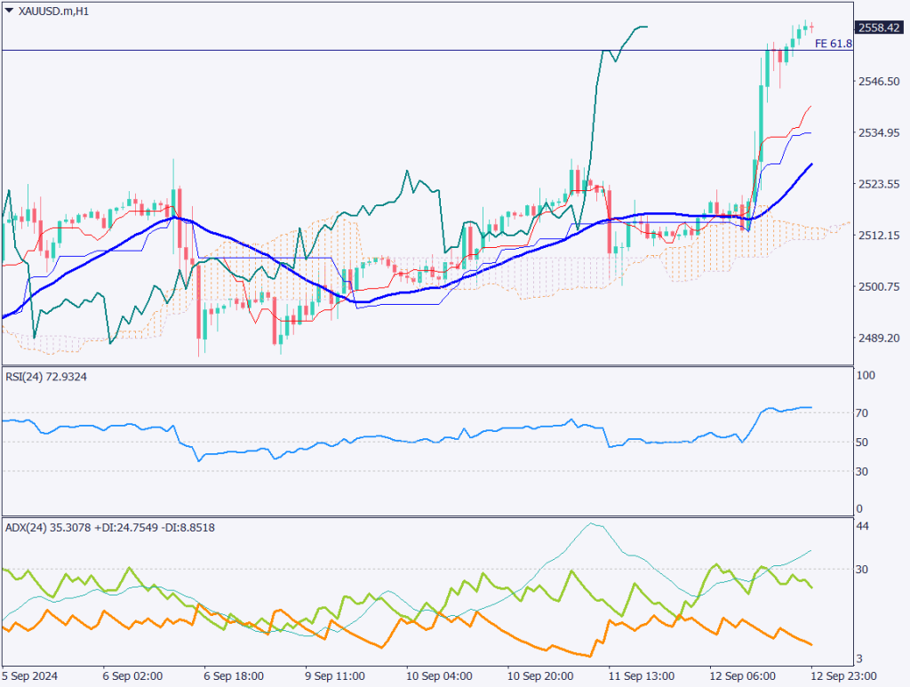 ゴールドの日足チャートを分析する。ゴールドはレンジ相場をブレイクアウトし、昨日の米経済指標をきっかけに2558ドルに上昇。史上最高値を更新した。フィボナッチエクスパンションの61.8%に差し掛かり、調整の動きもあると思われるが、基本的には上目線。