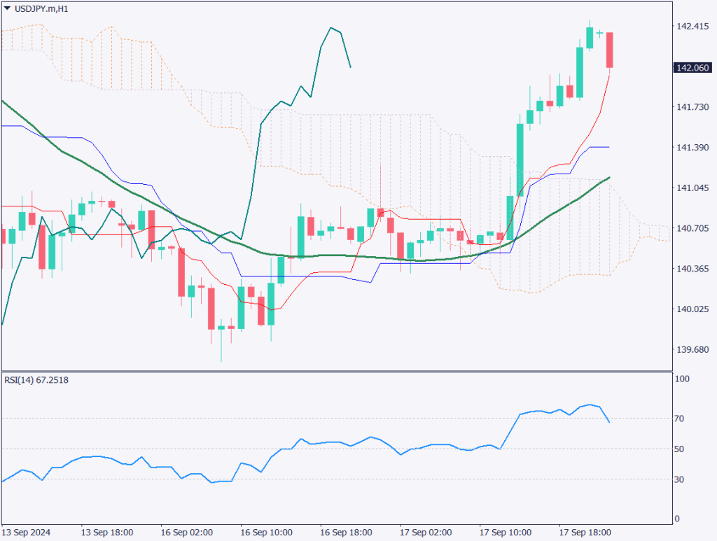 ドル円は142円台まで急上昇した。139円台まで売られていたが、米小売売上高が市場予想を上回ったことで反発し、転換線を上回って、ショートカバーやストップ注文を巻き込んで急騰したと考えられる。