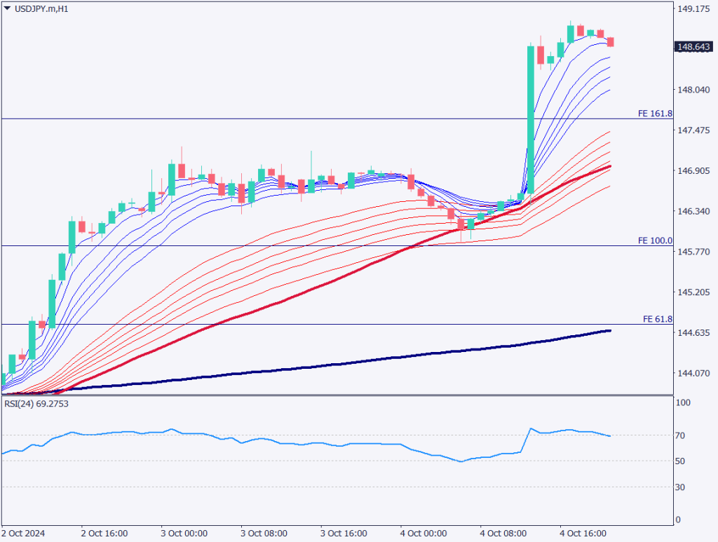 ドル円の1時間足チャートを分析する。ドル円は52移動平均線で反発し、一時149円台となった。米雇用統計が良好な結果となったことで、円高から一気に円安方向へ傾いた。売りポジションのストップロスを巻き込んで上昇したと考えられる。フィボナッチエクスパンションの161.8%を上回り推移。256.8%は150.40円付近が該当する。
