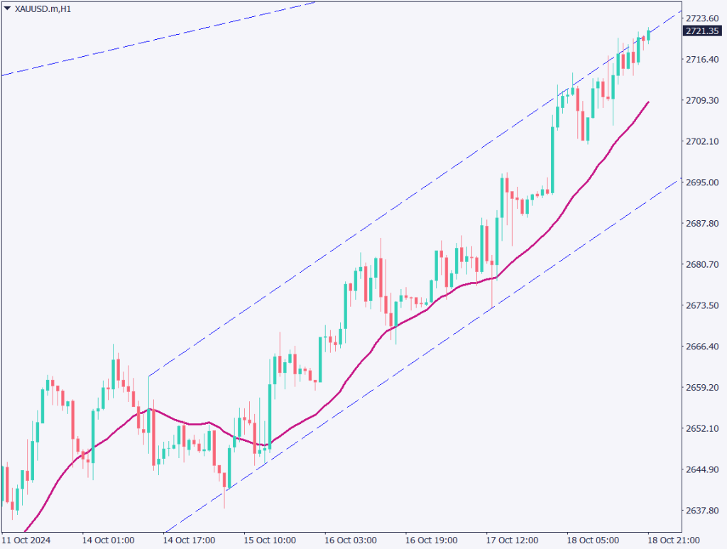 ゴールドの1時間足チャートを分析する。ゴールドは上昇チャネルを形成しており、上限ラインに張り付いている。反落する確率が高く、2700ドル台での買いポジションには慎重になりたいところ。10MAからも乖離しており、少なくとも、2700ドル前半までは下落する可能性がある。