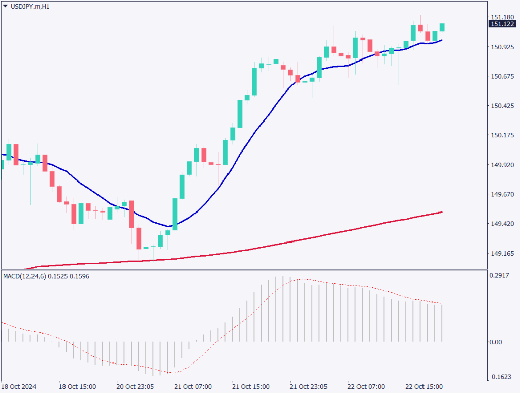 1時間足のドル円チャートを分析する。ドル円は10MAが支持線になっていることが確認できる。これは強いトレンドが発生している証拠となる。現在、151.12円付近で推移しており、上昇基調を維持している。
