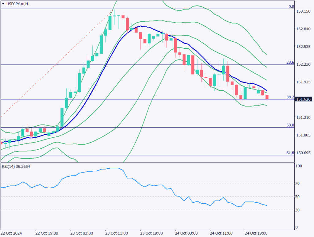 ドル円の1時間足チャートを分析する。ドル円は直近の上昇相場のフィボナッチリトレースメントを意識している。現在、38.2%が支持線となっているが、急激に上昇した相場であったため、50%に該当する151.13円付近まで下落する可能性もある。
