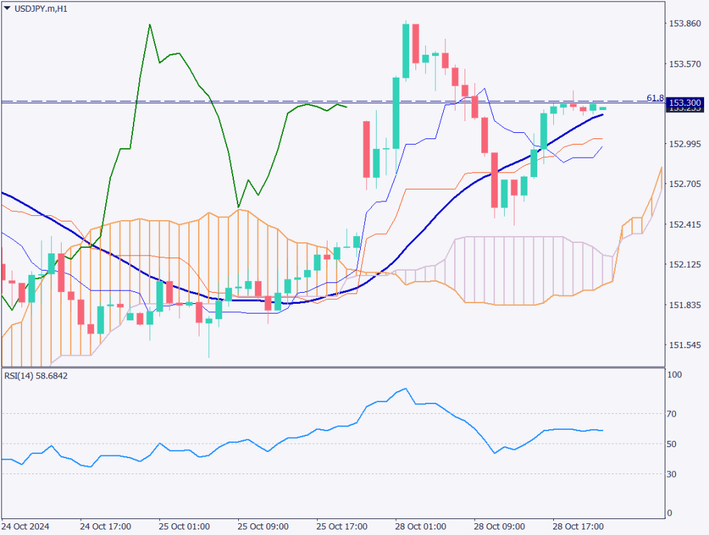 153.30円は直近の下落トレンドのフィボナッチリトレースメント61.8%に該当し、最後の防衛ラインとなる。10日移動平均線を支持線に上昇しており、153.30円を上抜けて155円台を目指すシナリオも想定したい。ただ、RSIが70を上回っているため、調整売りの可能性もある。