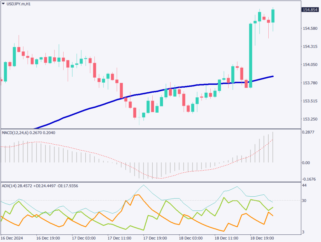 ドル円の1時間足チャートを分析する。ドル円はFOMC直後に大きく上昇し、155円台に接近している。本日の日銀会合では利上げ見送りになる予想であり、円安基調になる確率が非常に高い。