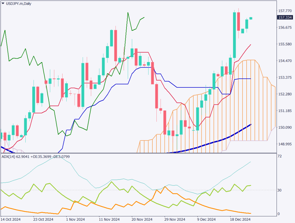 ドル円の1時間足チャートを分析する。1時間足は転換線が支持線となって上昇していることが確認できる。介入警戒感はあるが、ファンダメンタルは円安ドル高だ。157.75円の高値更新ができるかどうかが焦点だろう。