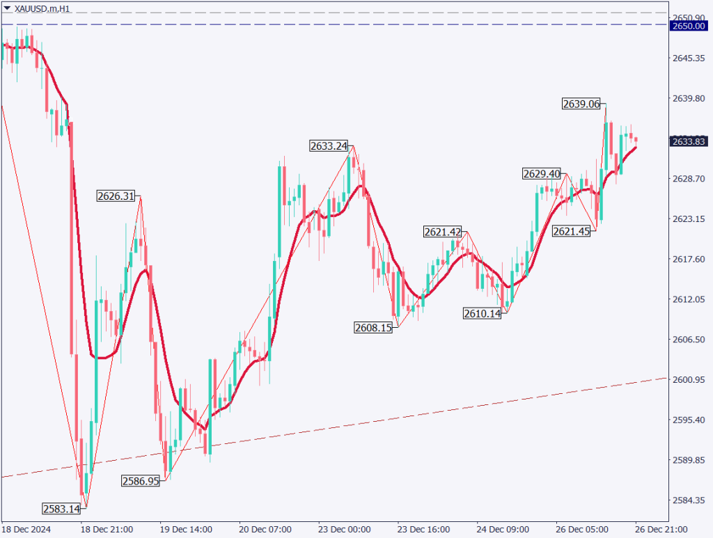 1時間足のゴールドチャートを分析する。ゴールドは10移動平均線に支えられながら、ゆっくりと上昇している。2633ドルの直近高値を上抜けて2639ドルまで上値を伸ばしている。