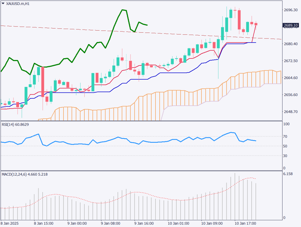 ゴールドの1時間足チャートを分析する。ゴールドは基準線・転換線に沿って上昇しており、現在は、転換線に接近している。再度直近高値を超えてこれば、2700ドル台に突入となる。