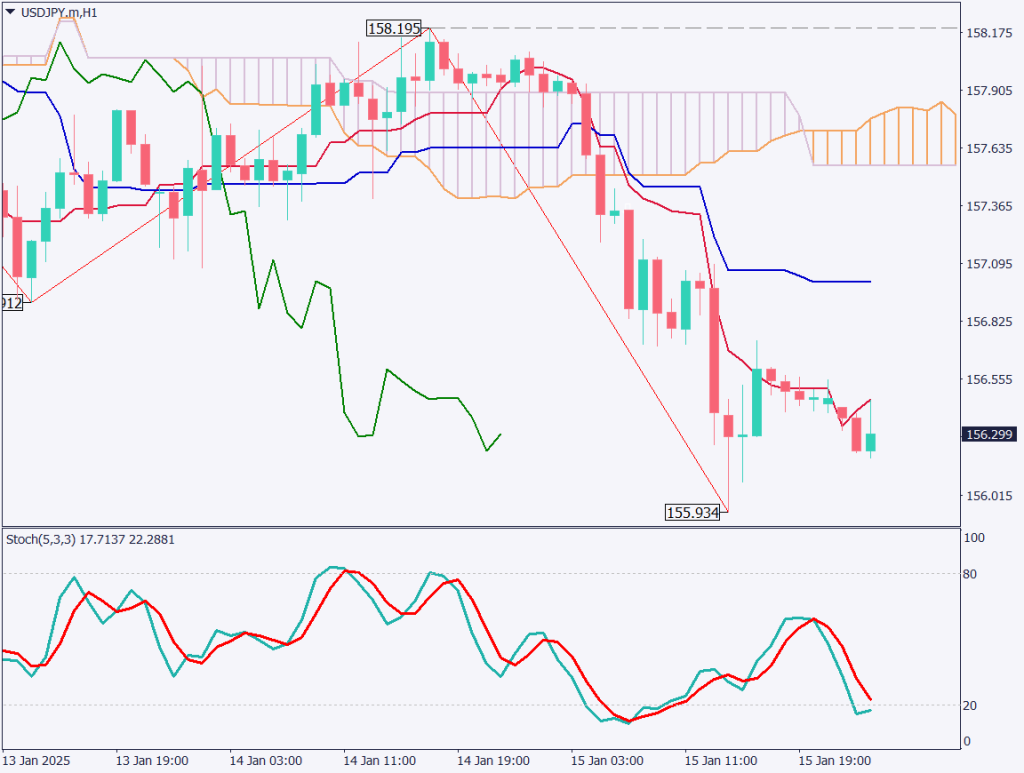 1時間足のドル円チャートを分析する。ドル円は158.20円を高値にして155.95円付近まで下落している。昨日で200Pips以上は下落している。日銀の利上げ観測が高まり、一気に円相場が動いた。事前にこういった内容が報道されるということは、利上げに向けての地ならしではないかと考えられる。